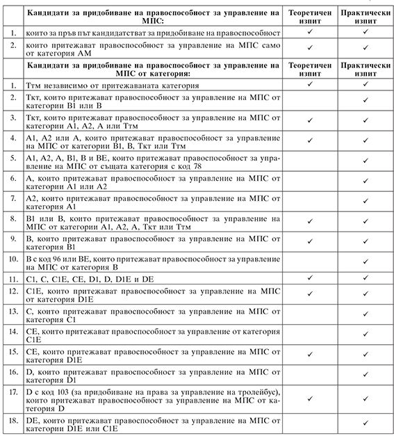 „(2) Кандидатите за придобиване на правоспособност за управление на МПС от категориите по чл. 150а, ал. 2 от ЗДвП полагат теоретичен и/или практически изпит за проверка на придобитите знания, умения и поведение и способността за възприемане на пътната обстановка съгласно приложение № 8.“