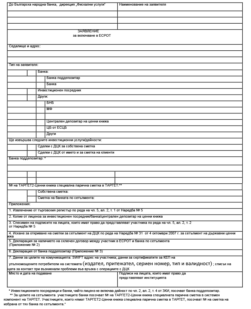(2) Кандидатите за участие в ЕСРОТ подават заявление на хартиен носител по образец (приложение № 1) до дирекция „Фискални услуги“ в БНБ, подписано от лицата, упълномощени да представляват институцията. Към заявлението се прилагат следните документи: