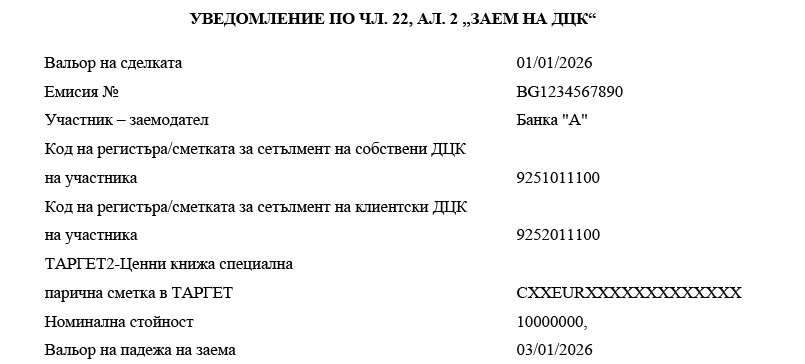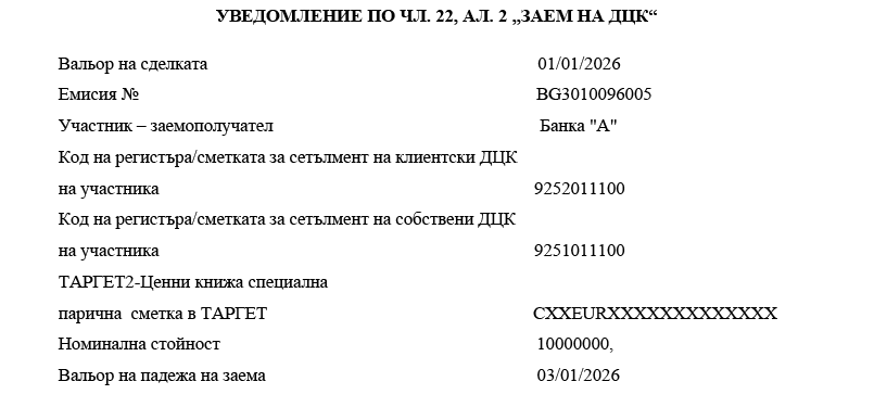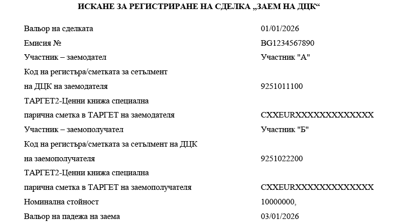 7. „Заем на ДЦК“ е всяка сделка, при която се извършва прехвърляне на ДЦК срещу обезпечение. Заемополучателят поема ангажимента да върне ДЦК от същата емисия и в същото количество на определена бъдеща дата. Сделката представлява сделка по предоставяне на ДЦК назаем за страната, прехвърляща ДЦК, и получаване назаем под формата на ДЦК за страната, получаваща ДЦК.