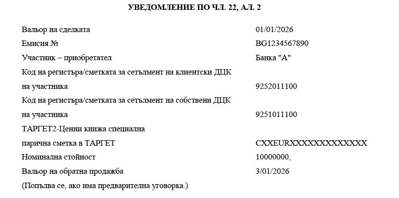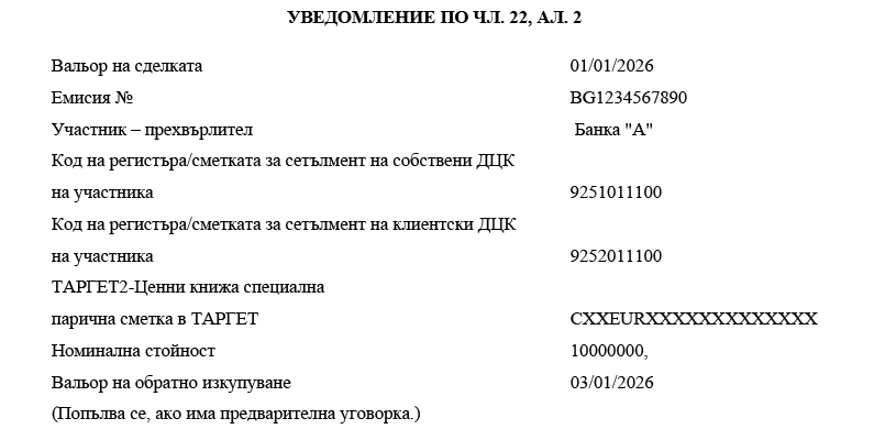 (5) В деня на обратното изкупуване/замяната БНБ, дирекция „Фискални услуги“, след приключване на сетълмента по ТАРГЕТ2-Ценни книжа специалните парични сметки в ТАРГЕТ и сметките за сетълмент на ДЦК отразява във водените от нея регистри обратно изкупените/заменените от всеки участник в аукциона и общо за негови клиенти ДЦК. Датата на сетълмента се приема за дата на обратното изкупуване/замяната с нови ДЦК.