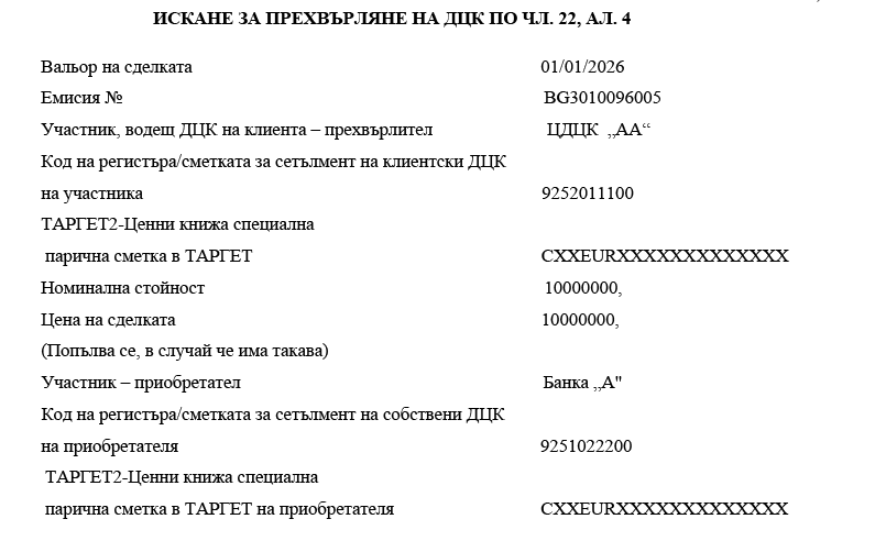 4. искане за откриване на сметки за сетълмент на ДЦК (приложение № 1 към чл. 9 от Наредба № 31 от 2007 г. за сетълмент на държавни ценни книжа);