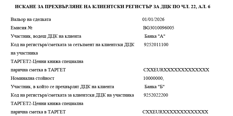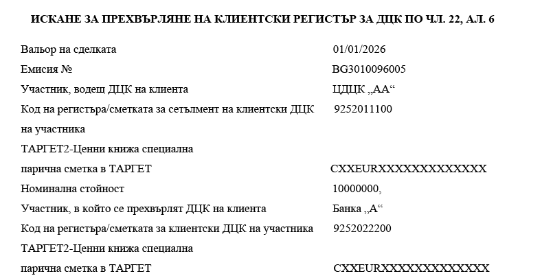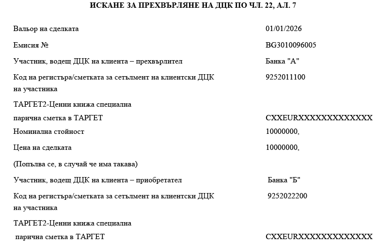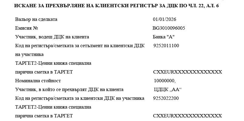 3. за целите на паричния сетълмент всяка банка по сетълмента, участник в системния компонент ТАРГЕТ-БНБ или в друг системен компонент на ТАРГЕТ, подава искане до БНБ или друга централна банка за свързване на своята ТАРГЕТ2-Ценни книжа специална парична сметка в ТАРГЕТ с една или повече сметки за сетълмент на ДЦК.