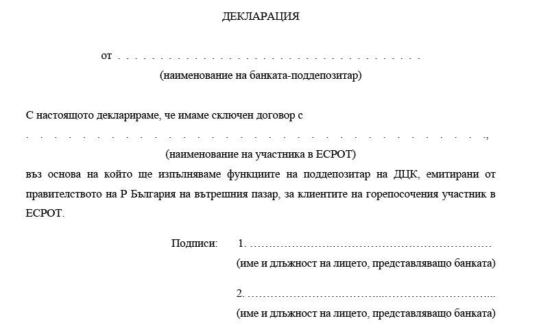 (5) Участниците в ЕСРОТ по чл. 3, ал. 1, т. 1, 3 и 4, които не са поддепозитари на ДЦК, прилагат декларация от избрана от тях банка поддепозитар (приложение № 3) въз основа на сключен с нея договор, в която ще депозират ДЦК, които са прехвърлили на клиенти.