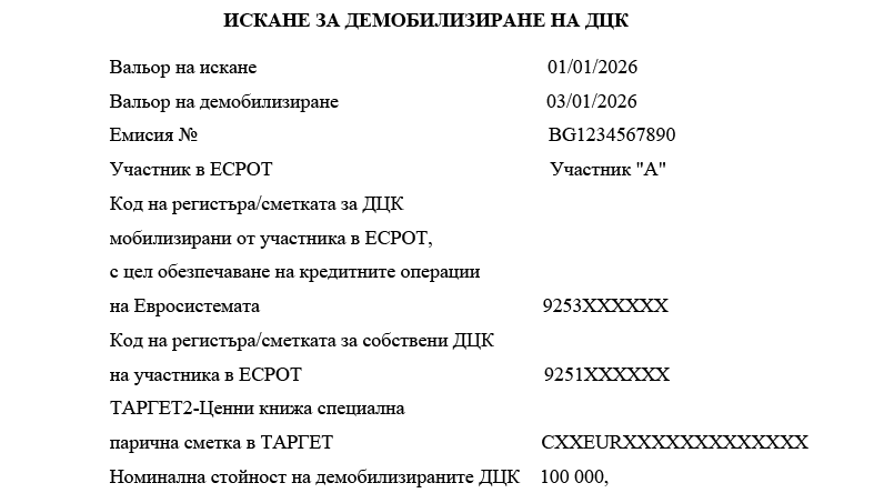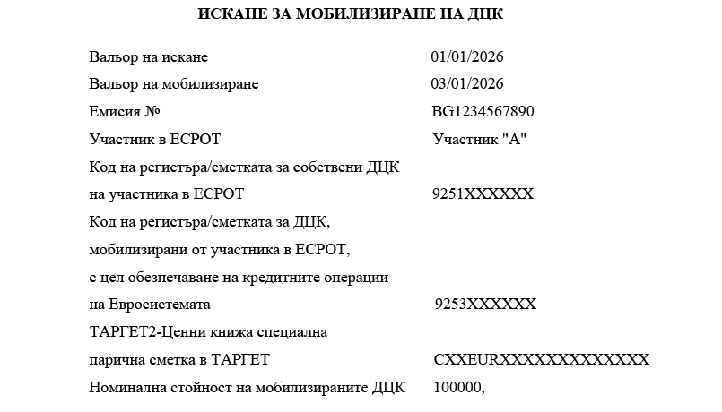 12. „Мобилизиране на ДЦК“ е прехвърляне на ДЦК, без промяна на собствеността, от сметка за ДЦК, собственост на участник в ЕСРОТ, по сметка за ДЦК на БНБ във връзка с обезпечаване на кредитни операции на Евросистемата.