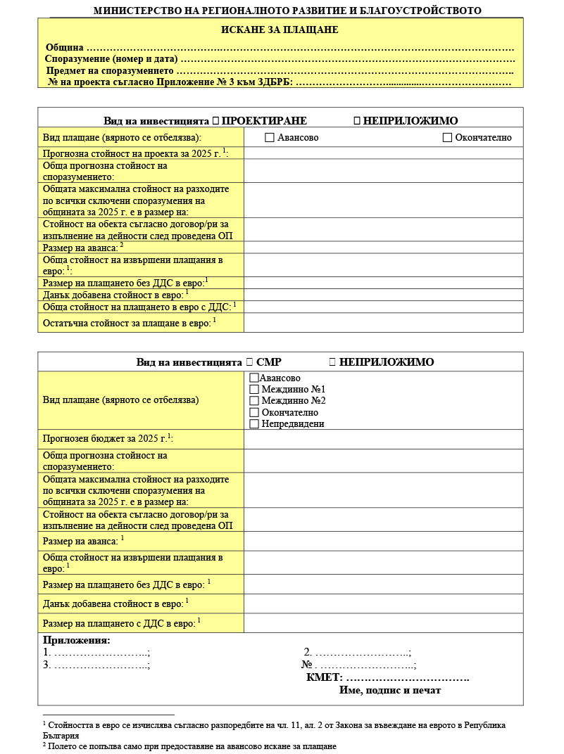 (7) Изплащането на разходи се извършва въз основа на подадено искане за плащане от съответната община до Министерството на регионалното развитие и благоустройството (МРРБ), придружено с декларация/декларации и документите по чл. 113, ал. 2 от Закона за държавния бюджет на Република България за 2025 г. и изготвените от министъра на регионалното развитие и благоустройството образци.