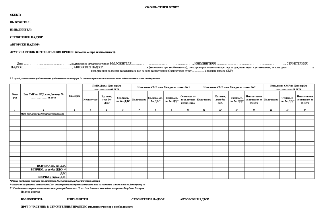 4. окончателното плащане в размер на остатъчната стойност на разходите, но не повече от 10 на сто, съгласно предложената цена и количествено-стойностна сметка, към сключения/сключените договор/договори с изпълнител/изпълнители се извършва текущо след получаване в МРРБ на искане за окончателно плащане – по образец, съгласно приложение № 1, придружено с акт за въвеждане в експлоатация на обекта, издаден преди 30 юни 2027 г., съгласно Наредба № 2 от 2003 г. за въвеждане в експлоатация на строежите в Република България и минимални гаранционни срокове за изпълнени строителни и монтажни работи, съоръжения и строителни обекти (обн., ДВ, бр. 72 от 2003 г.; изм. и доп., бр. 49 от 2005 г., бр. 98 от 2012 г., бр. 65 от 2016 г., бр. 87 от 2017 г. и бр. 89 от 2019 г.) и Закона за устройство на територията; към окончателното искане за плащане общините прилагат окончателен отчет/акт, удостоверяващ изпълнените и приети СМР – по образец, съгласно приложение № 3, подписани от всички участници в строителния процес;