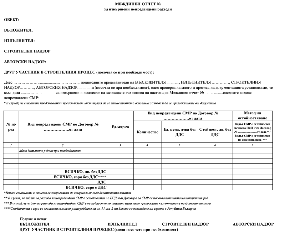5. извършване на плащане на „Непредвидените разходи“ (до размера на реално приетите непредвидени разходи, но не повече от 10 на сто от предвидените СМР съгласно сключения/сключените договор/договори с изпълнител/изпълнители) се извършва еднократно след изпълнение на всички предвидени СМР и се отчитат отделно с представяне на образец съгласно приложение № 4 (подписани от всички участници в строителния процес), придружено с отчети/актове, удостоверяващи изпълнените непредвидени СМР; отчитането на непредвидени разходи се извършва при доказана и приета от Възложителя необходимост съгласно изискванията на сключения/сключените договор/договори с изпълнител/изпълнители и действащото законодателство; плащания по искания за непредвидени разходи се извършват текущо след получаване в МРРБ на искане за плащане по образец – приложение № 1.