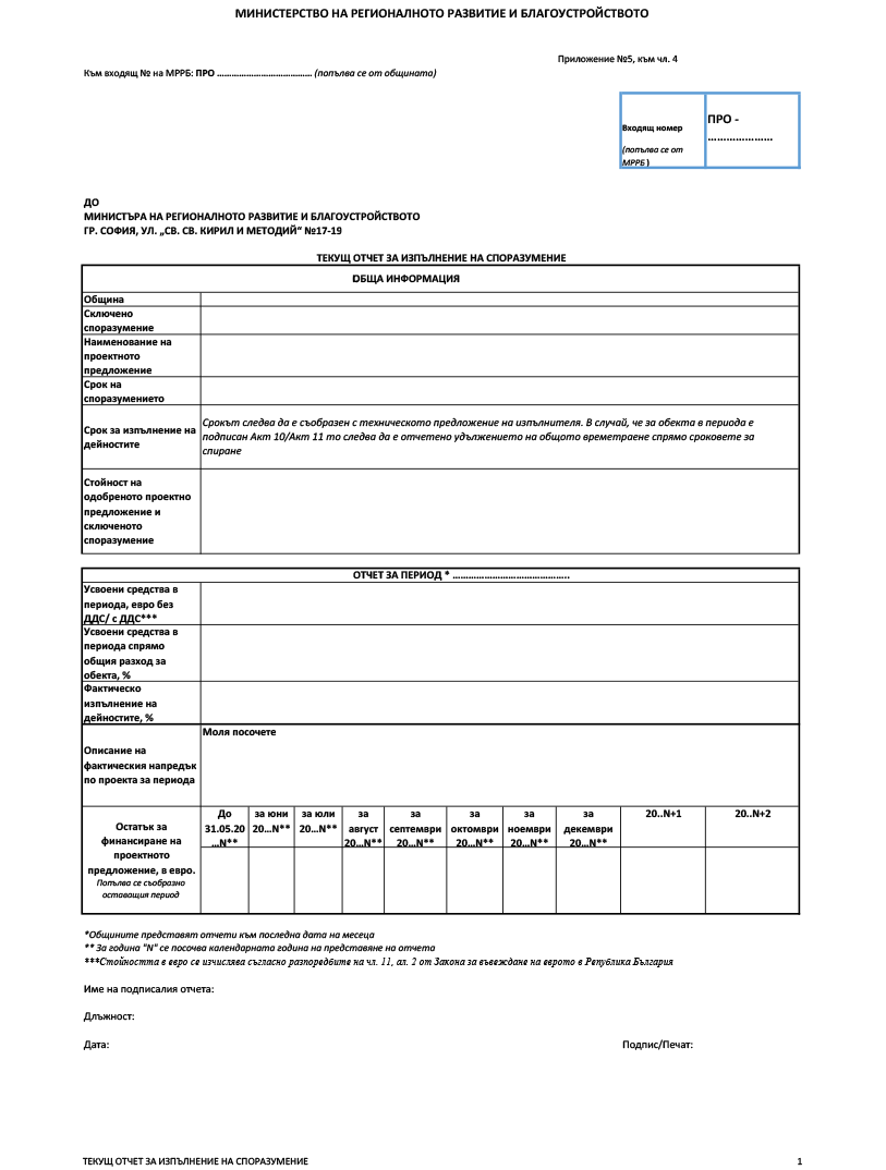 Чл. 4. Кметовете на общини предоставят на министъра на регионалното развитие и благоустройството месечни отчети за изпълнение на сключените споразумения, съдържащи информация за фактическото и финансовото изпълнение на проекта, както и прогноза за финансовите потоци, които ще са им необходими по години до края на срока за изпълнение на целия проект – по образец, съгласно приложение № 5.