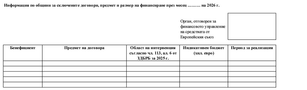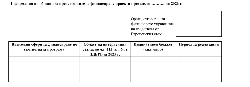 Чл. 6. До приемането на Закона за държавния бюджет на Република България за 2026 г. органите, отговорни за финансовото управление на средствата от Европейския съюз, включително Държавен фонд „Земеделие“, предоставят до 10-о число на месеца, следващ отчетния месец, на МРРБ, на Министерството на финансите и на областните информационни центрове по чл. 20, ал. 1 от Закона за управление на средствата от европейските фондове при споделено управление информация по общини за сключените договори, предмет и размер на финансиране през отчетния месец и информация за предстоящите за финансиране общински проекти за текущия месец, в обхвата на дейностите по чл. 113, ал. 1 от Закона за държавния бюджет на Република България за 2025 г. (по образец съгласно приложение № 7 и приложение № 8).